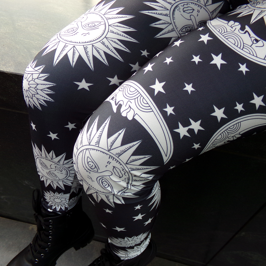 The perfect legging for astrology. The sun black leggings are high density, slightly glossy and high quality fabric legging. High density elastic fabric can be very good to wrap the body but will not make you feel uncomfortable tight. Perfect for any outfit.