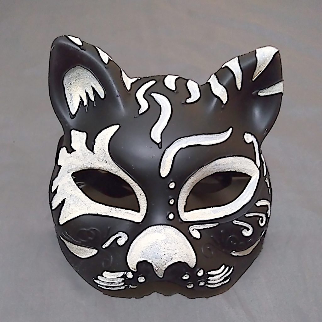Gorgeous cat Venetian mask with black on white glitter surface. Let the cat out.